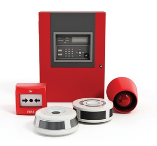 A fire alarm system is a network of devices, including smoke and heat detectors, manual call point, more other types of Detectors and a central fire alarm control panel (FACP), that detects a fire and activates audio-visual alarms (like bells, horns, and strobes) to warn occupants and trigger a response from emergency services. These systems are categorized by their function, with "L" systems focused on protecting life, "P" systems on protecting property, and "M" systems relying on manual activation. The system's components can operate or integrate the other building safety features, such as Fire sprinkler systems, Fire Suppression Systems etc.